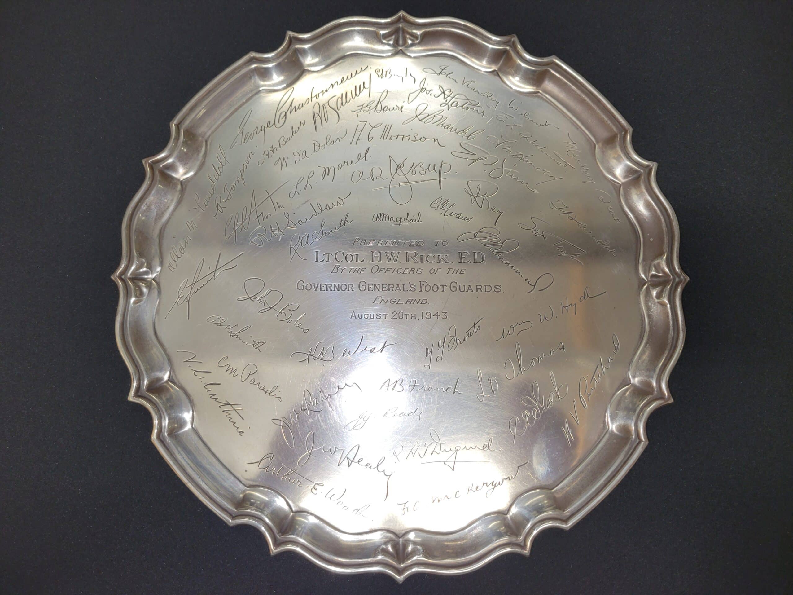 Ornamented silver plate presented to LtCol HW Rick, ED, by the officers of the Governor General’s Foot Guards, England, August 20th, 1943.